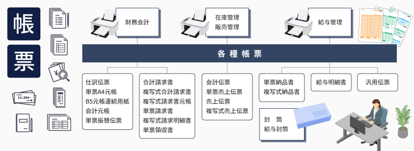 - 販売管理、在庫管理、給与管理、財務会計などに必要な各種帳票を取り揃えております。弥生株式会社製ソフト(弥生販売、弥生給与、弥生会計など)やPCA社製ソフト(PCA商魂、売上じまん、PCA給与、給与じまん、仕入じまんなど)に対応したレイアウトです。