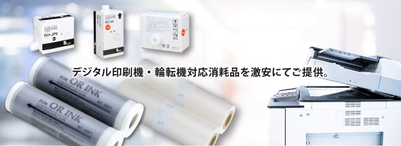 デジタル印刷機・輪転機対応消耗品を激安にてご提供。 RISO リソー、Duplo デュプロ、RICOH リコー、KONICA MINOLTA コニカミノルタ、HORII ホリイ、edisys エディシス、TEC 東芝テック など大手有名メーカー対応インクからマスター(版)を数多く取り揃えています。メーカー品だけでなく、高品質で低価格を実現した汎品タイプや良品ボトル容器のみ再利用したリサイクルボトルインクも大好評販売中です。